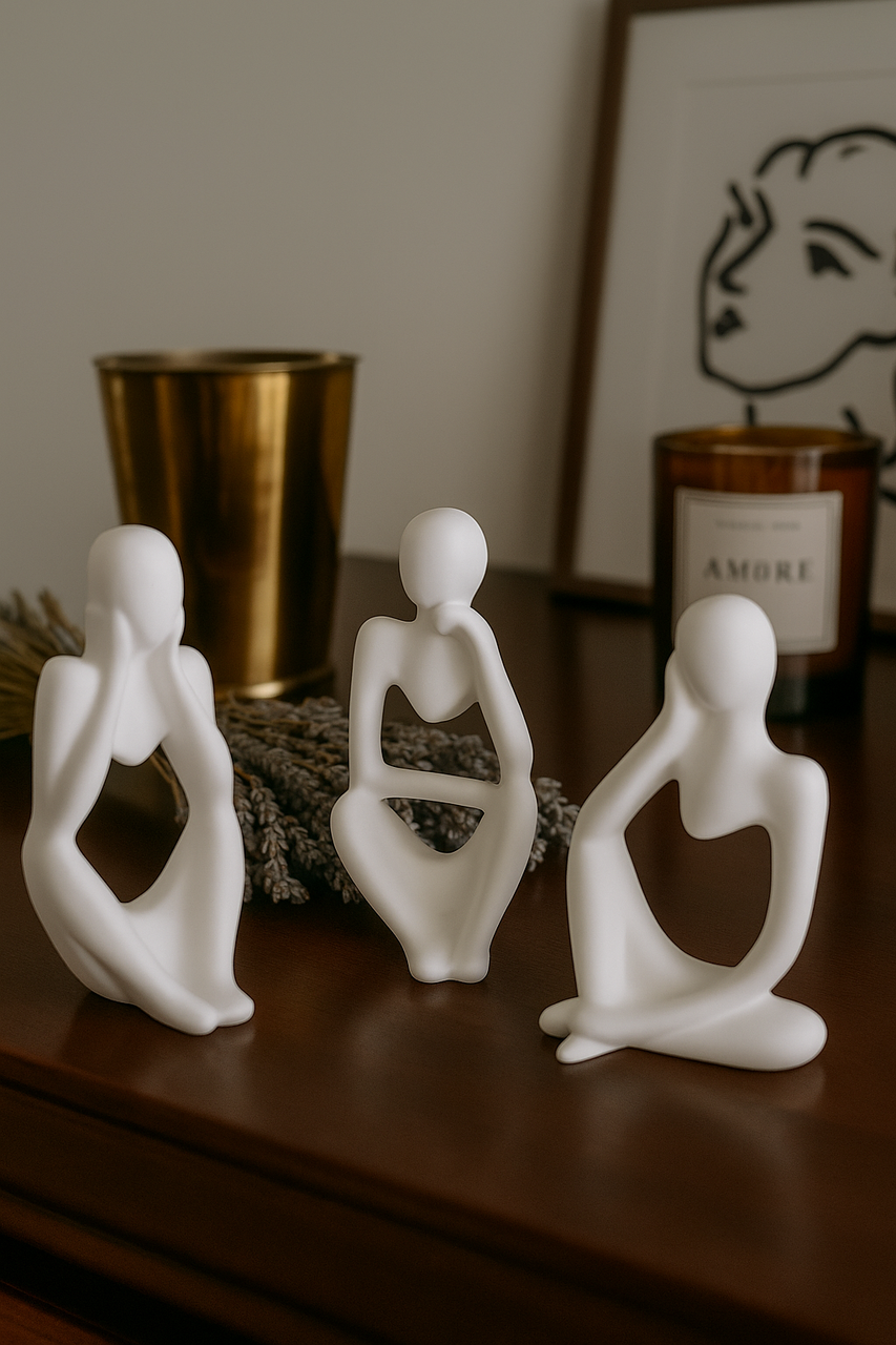 Набор статуэток из гипса Мыслители. Выполнена из экологически чистого, высокопрочного гипса, она имеет плоское дно, благодаря чему устойчивая и удобная. Идеально впишется в любой интерьер дома, кафе, ресторана, салонов красоты и студии красоты или любого другого общественного заведения. Белая минималистичная декоративная фигурка будет уместна в стиле: классика, лофт, модерн, ар-деко, фьюжн, хай-тек и других. Предметы интерьера, которые оценят девушки, и будут гармоничны даже в офисе серьезного мужчины. Гипсовые статуэтки - необычный и модный декор для дома, это товары для дома, которые радуют глаз и поднимают настроение. Отдельные маленькие детали можно долго рассматривать. Гипсовые изделия - это необычные опоры, подставки для книг на полку, украшение комнаты. Гипс чувствителен к воде, поэтому, чтобы статуя вас радовала длительное время и не повредилась, рекомендуем покрыть ее акриловых или любым другим гидрофобным лаком. Гипсовые романтичные фигурки это аксессуары для дома, которые станут отличным подарком женщине или мужчине на новоселье или как красивые сувениры на память в любой значимый день. На изделии допускаются мелкие дырочки, которые свойственны предметам из гипса.